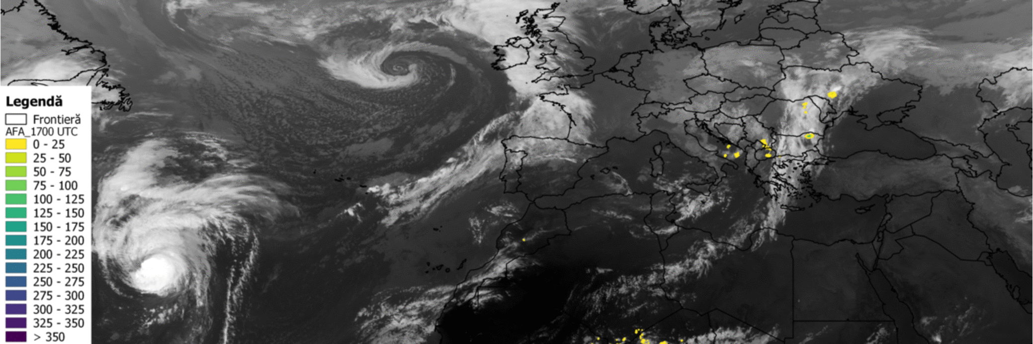 Figure 6. Another comparison between the Level 2 LI Accumulated Flash Area (AFA) with data from the Romanian ground-based Lightning Location Network for October 5, 2024, from 17:00 to 19:00 UTC.