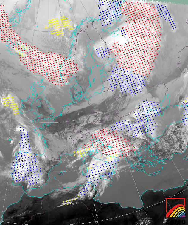 Figure 2: IR satellite image from 28th March 2011, 13 UTC, superimposed by the corresponding ASIINWP product.