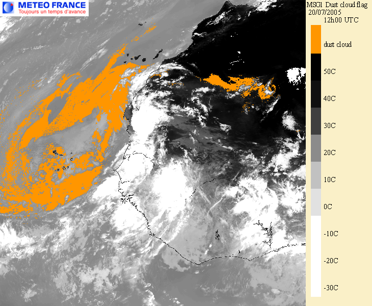 Example of SEVIRI dust cloud flag superimposed on a 10.8µm infrared image: 20th July 2005 at 12h00 UTC.