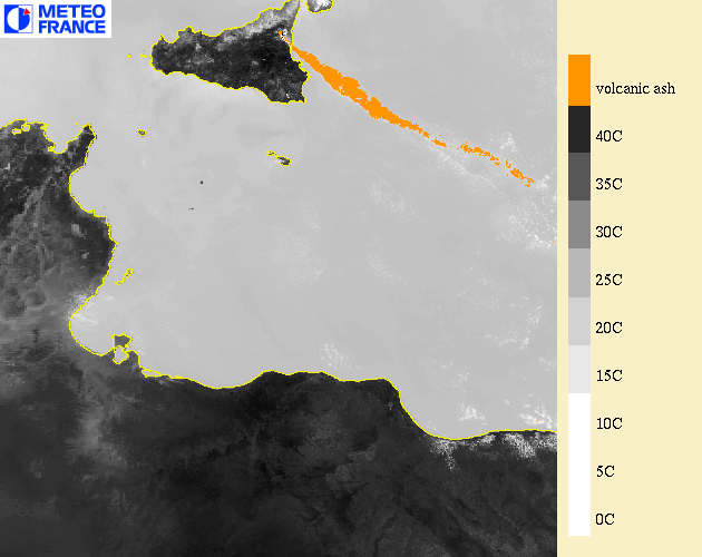 Example of MODIS volcanic ash cloud superimposed on a 10.8µm infrared image: Etna eruption on 22nd July 2001 at 9h55 UTC