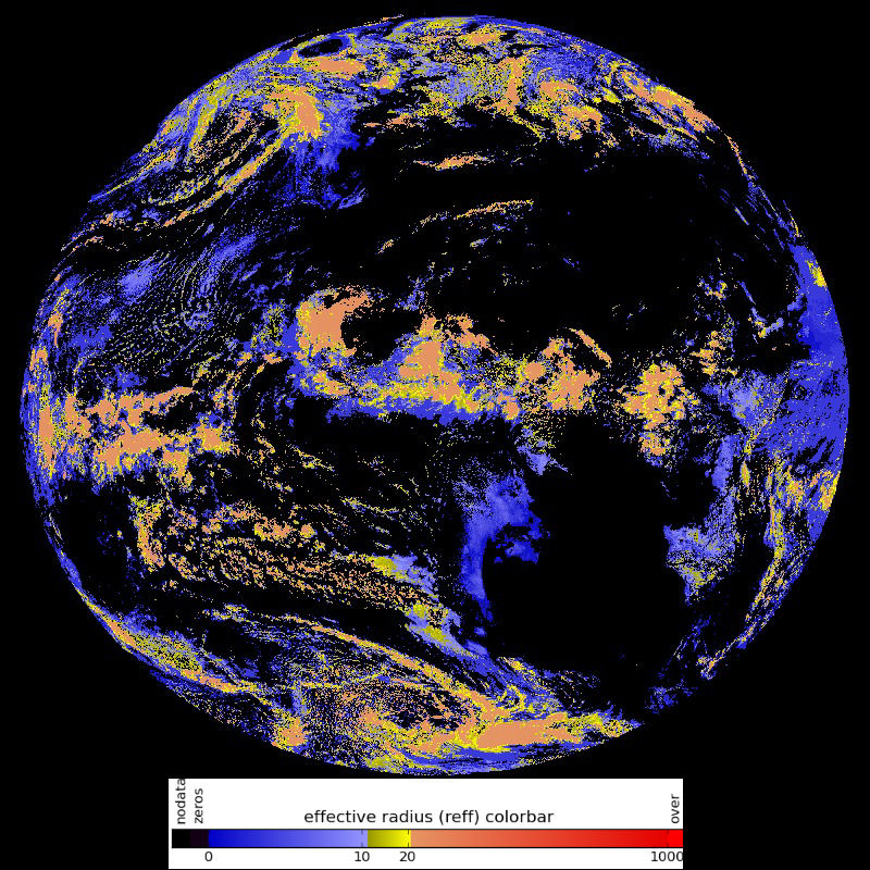 Colour palettes are included in CMIC NetCdF files, thus allowing an easy visualisation of cloud top effective radius (as illustrated on the SEVIRI example), optical thickness, phase, liquid and ice water path.