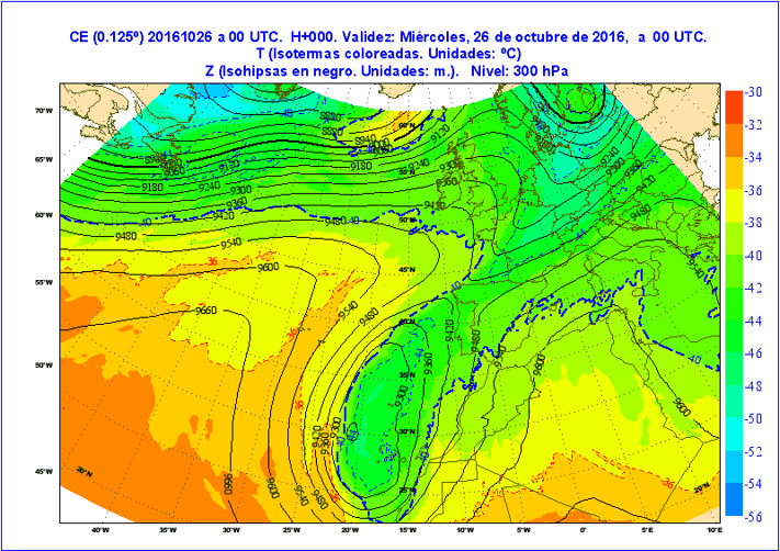Temperature and Pressure fields at 300 hPa expected at 00Z from 00Z forecast (Analysis)